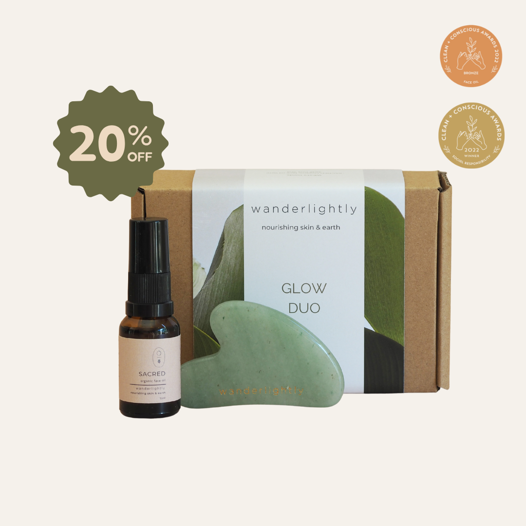 A radiant pairing to nourish, sculpt, and glow. The Sacred Organic Face Oil restores and softens the skin, while the jade Gua Sha boosts circulation, aids lymphatic drainage, reduces puffiness, and releases facial tension for a calming, luminous daily ritual.