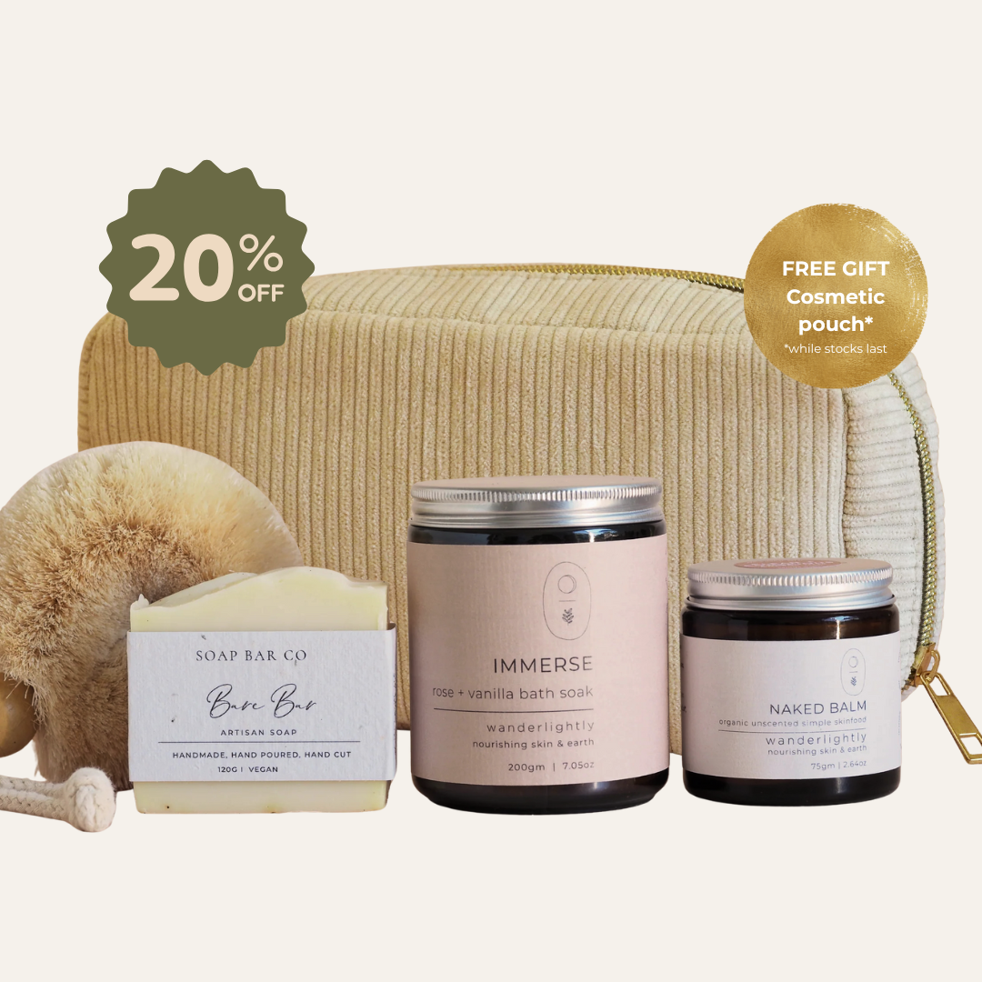 Begin your spring ritual with a restorative soak in mineral-rich salts to ease tension and refresh body and mind. As you bathe, lather with the Bare Body Bar and gently exfoliate with the palm-sized brush to sweep away winter layers and reveal smooth, renewed skin. Complete your ritual by massaging Naked Balm into dry or delicate areas to lock in moisture and leave skin soft, supple and glowing for the season ahead.