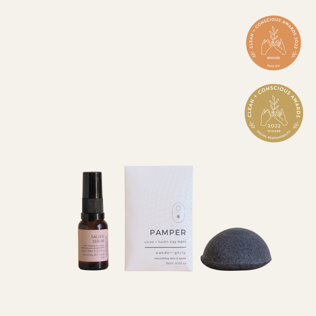 A nourishing ritual for soft, quiet moments of care. This trio restores balance with Organic Sacred Face Oil to soften and renew, the Pamper Clay Mask to purify and replenish, and a delicate Konjac Sponge to cleanse with ease. A gentle rhythm for luminous, well-loved skin.